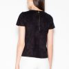 Luchtige, suède blouse met korte mouwen en een halfronde halslijn. Decoratieve gouden ritssluiting aan de achterkant. Klassieke snit, ideaal voor alledaags gebruik.