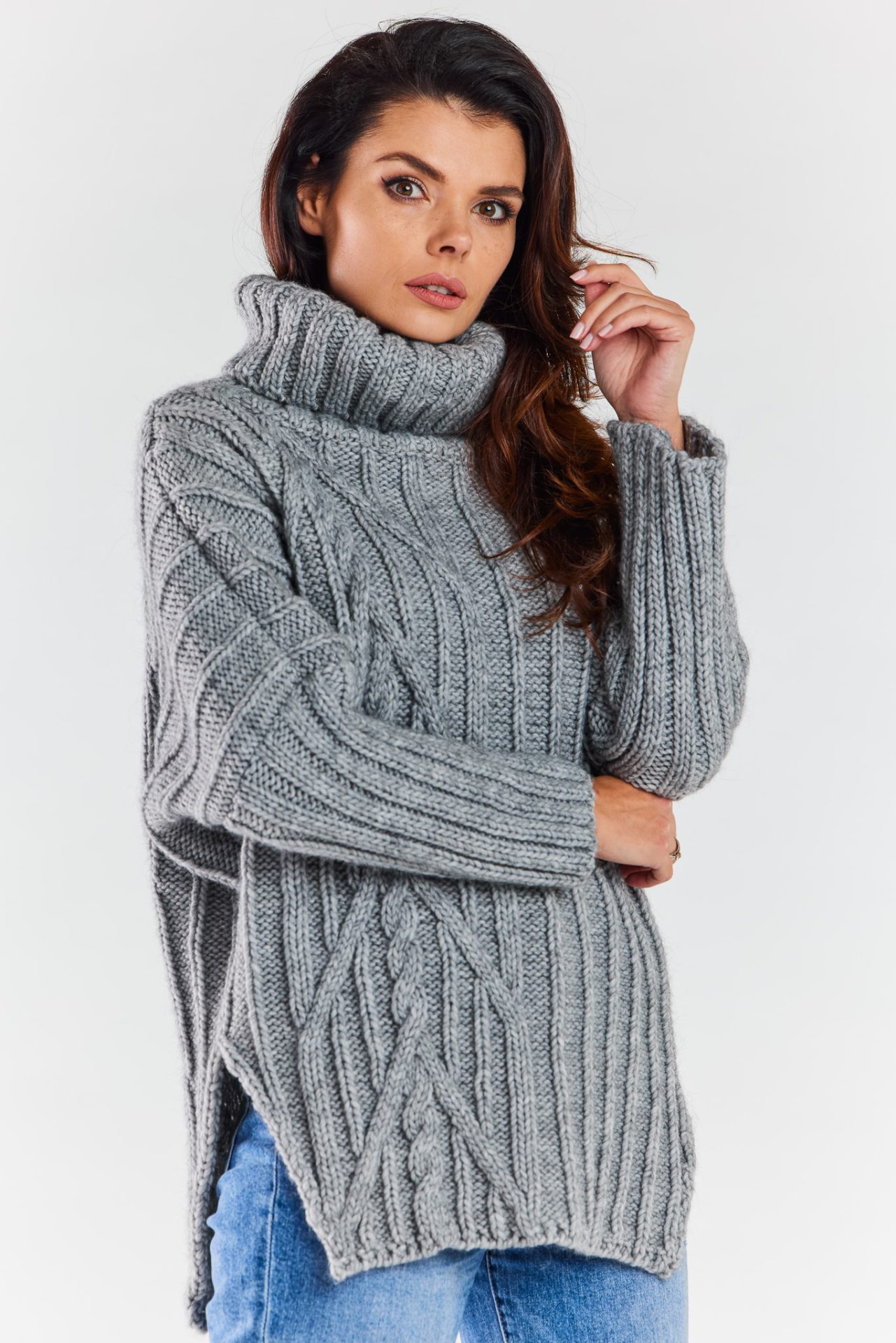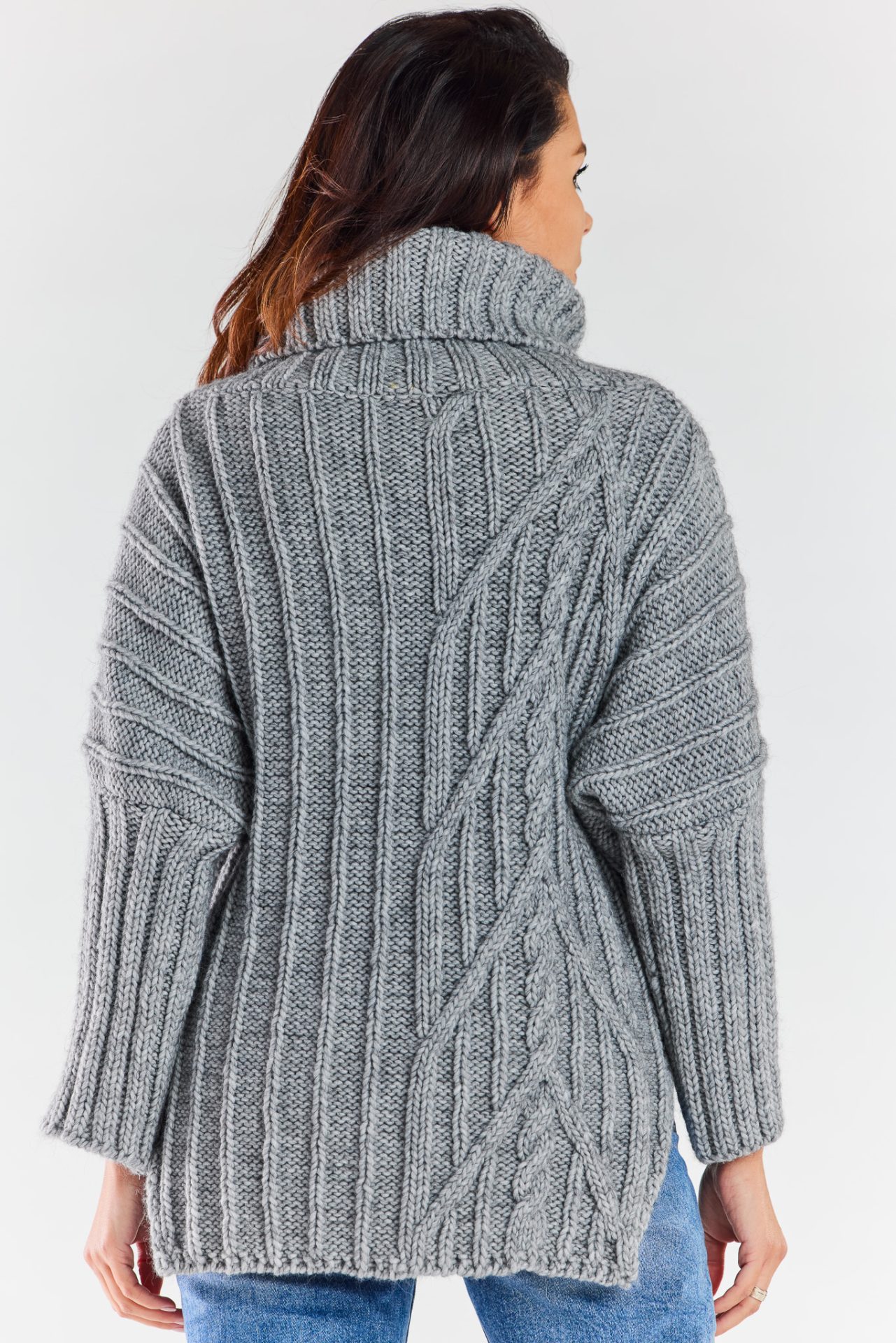 Warme damestrui met lange mouwen en col. Coltrui met decoratieve geruite versieringen. Splitjes aan de zijkanten.