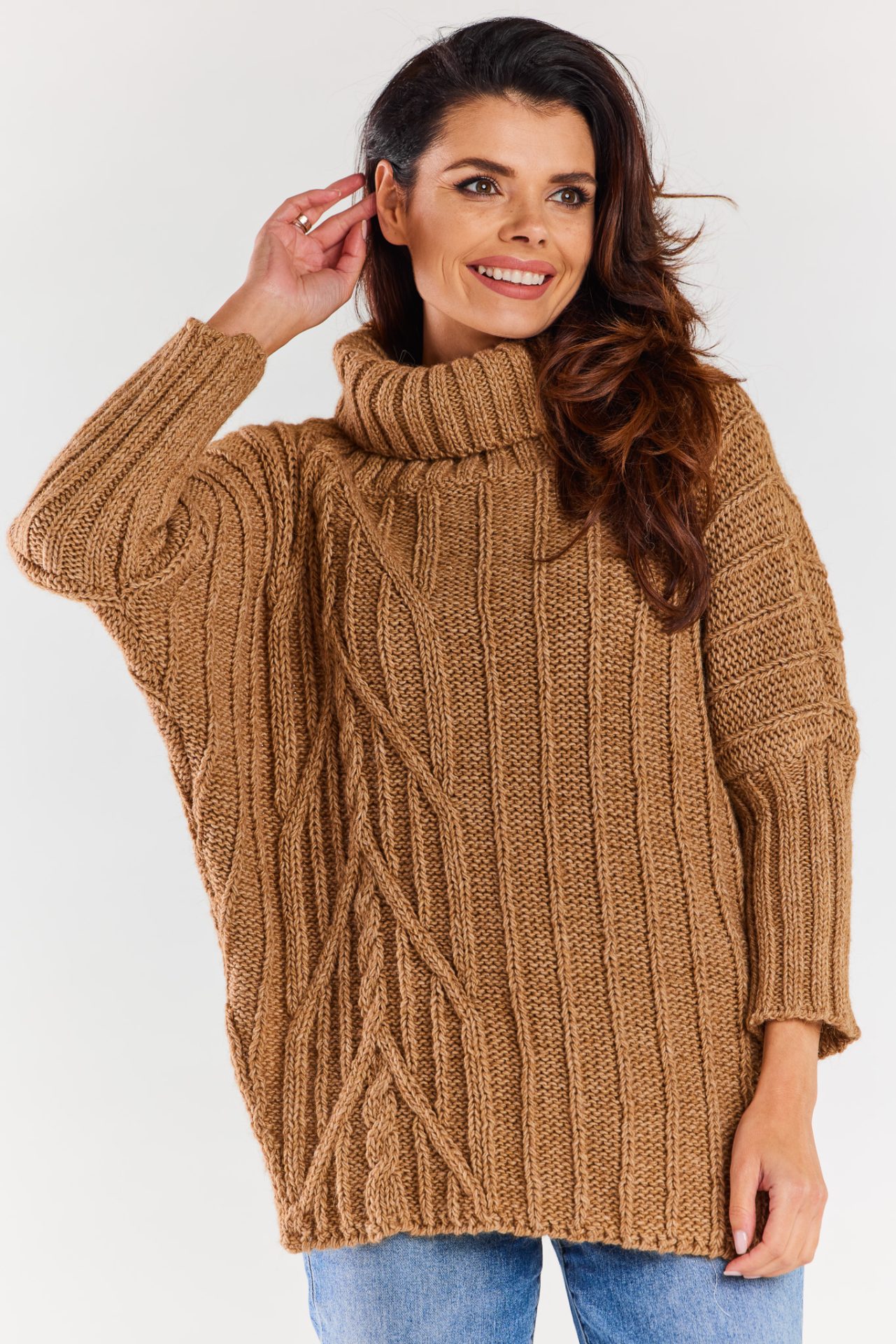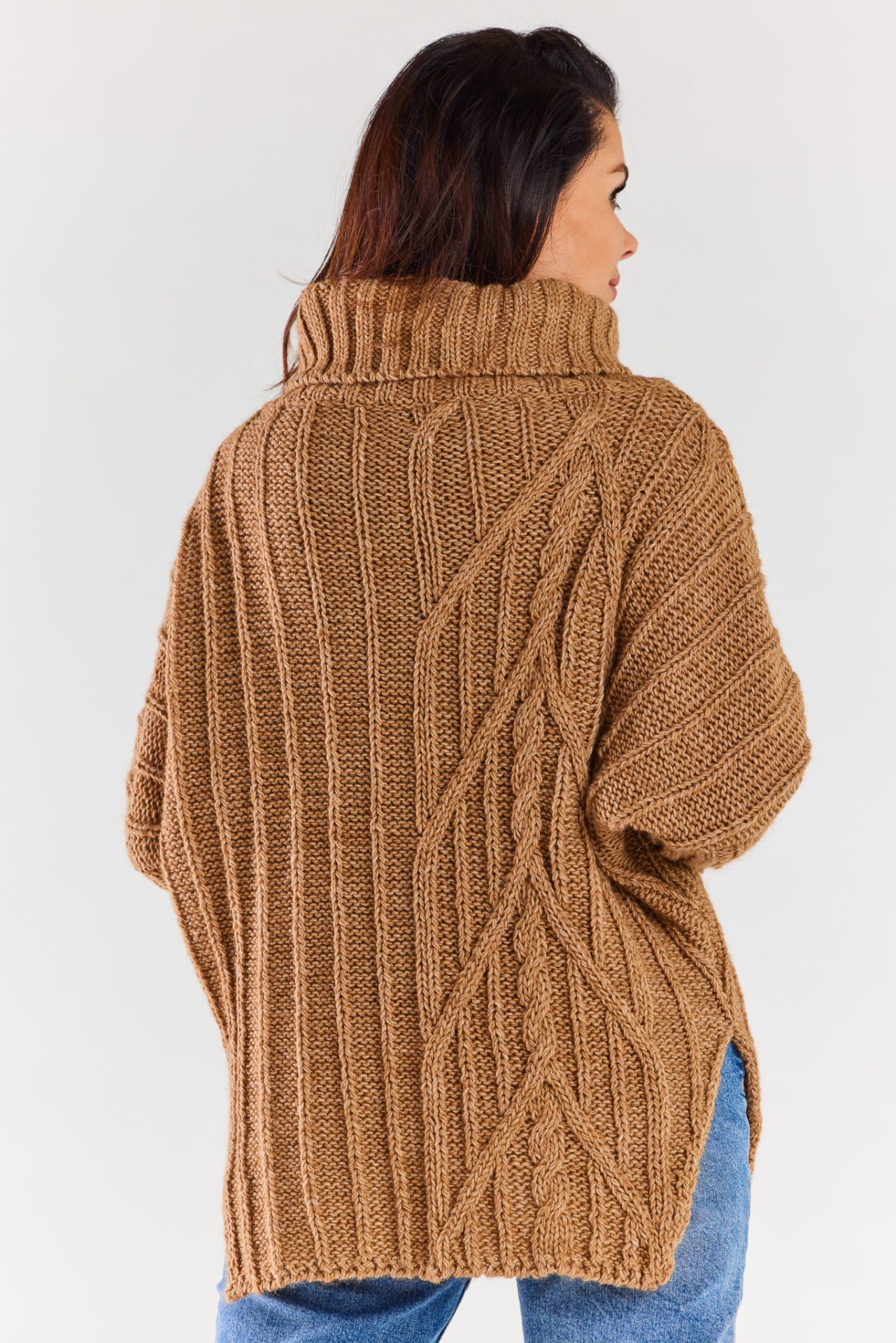 Warme damestrui met lange mouwen en col. Coltrui met decoratieve geruite versieringen. Splitjes aan de zijkanten.