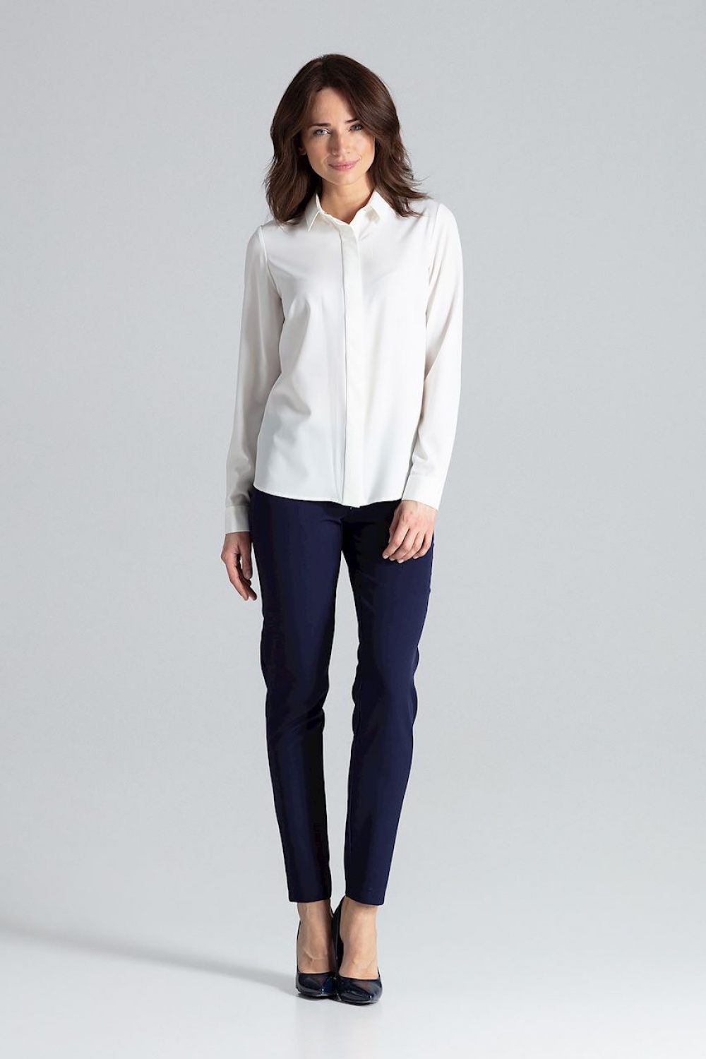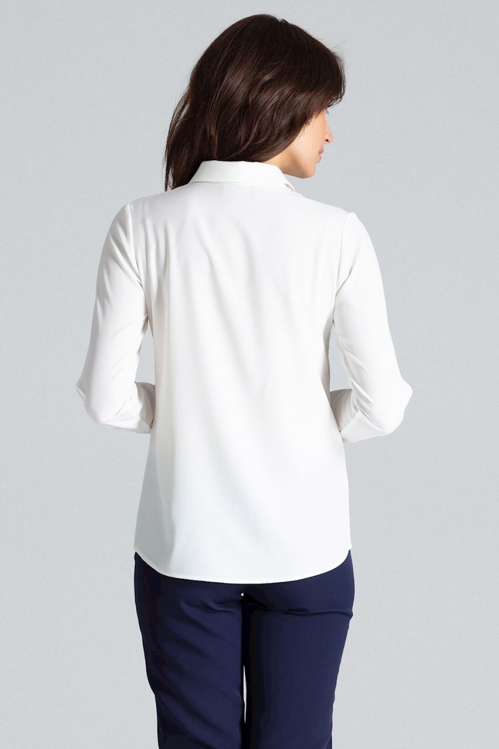 Klassiek dameshemd met kraag. Verborgen drukknoopsluiting. Kraag en manchetten ook vastgemaakt met zilveren decoratieve drukknopen. Perfect voor vele gelegenheden.