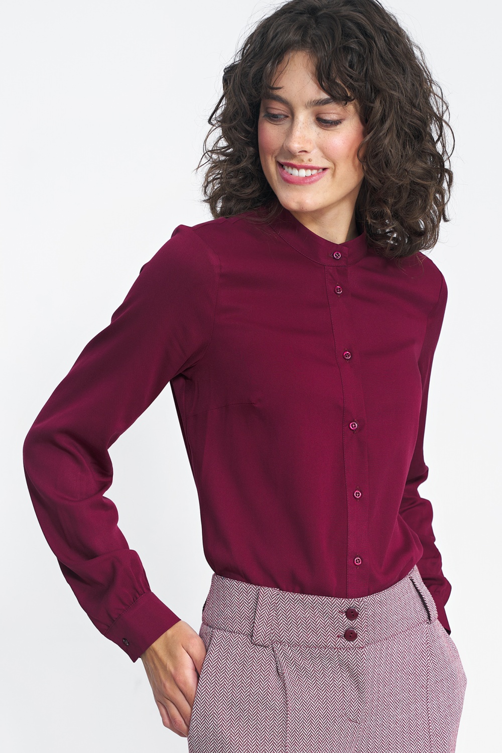 Dit is een van onze eerste voorstellen voor de herfst. Het is een effen overhemd met lange mouwen die zijn afgewerkt met manchetten en een opstaande halslijn. Het past perfect bij pakken in verschillende kleuren en is de ideale basis voor een zakelijke styling. Als extraatje houdt het materiaal van 100% viscose je de hele dag comfortabel.