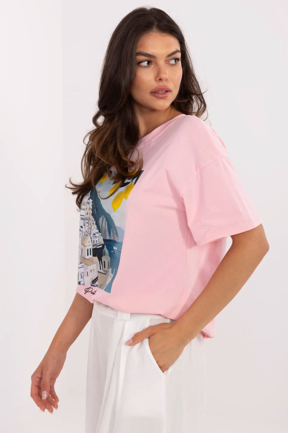 Dit casual T-shirt is de ideale keuze voor vrouwen die comfort en een modieuze uitstraling waarderen. Gemaakt van hoge kwaliteit katoen met toevoeging van elastaan, zorgt voor zachtheid, ademend vermogen en comfortabel dragen gedurende de hele dag. De standaard lengte en klassieke ronde hals maken dat het shirt perfect aansluit bij de lichaamsvorm, terwijl de korte mouwen het een luchtige uitstraling geven. De belangrijkste versiering is de originele print, die het geheel een fris karakter geeft. Ideaal voor dagelijkse styling, past goed bij zowel jeans als joggingbroeken of een rok. Dit T-shirt is een must-have in de garderobe van elke liefhebber van comfortabele en stijlvolle mode!